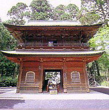 比叡山の総門として根本中堂正面の石段上にそびえる重層の楼門。八六一年(貞観三)、慈覚大師円仁が中国五台山の霊石を埋めて創建しました。現在の建物は一六四二年(寛永十九)の再建で、楼上には智恵第一の文殊菩薩がまつられています。